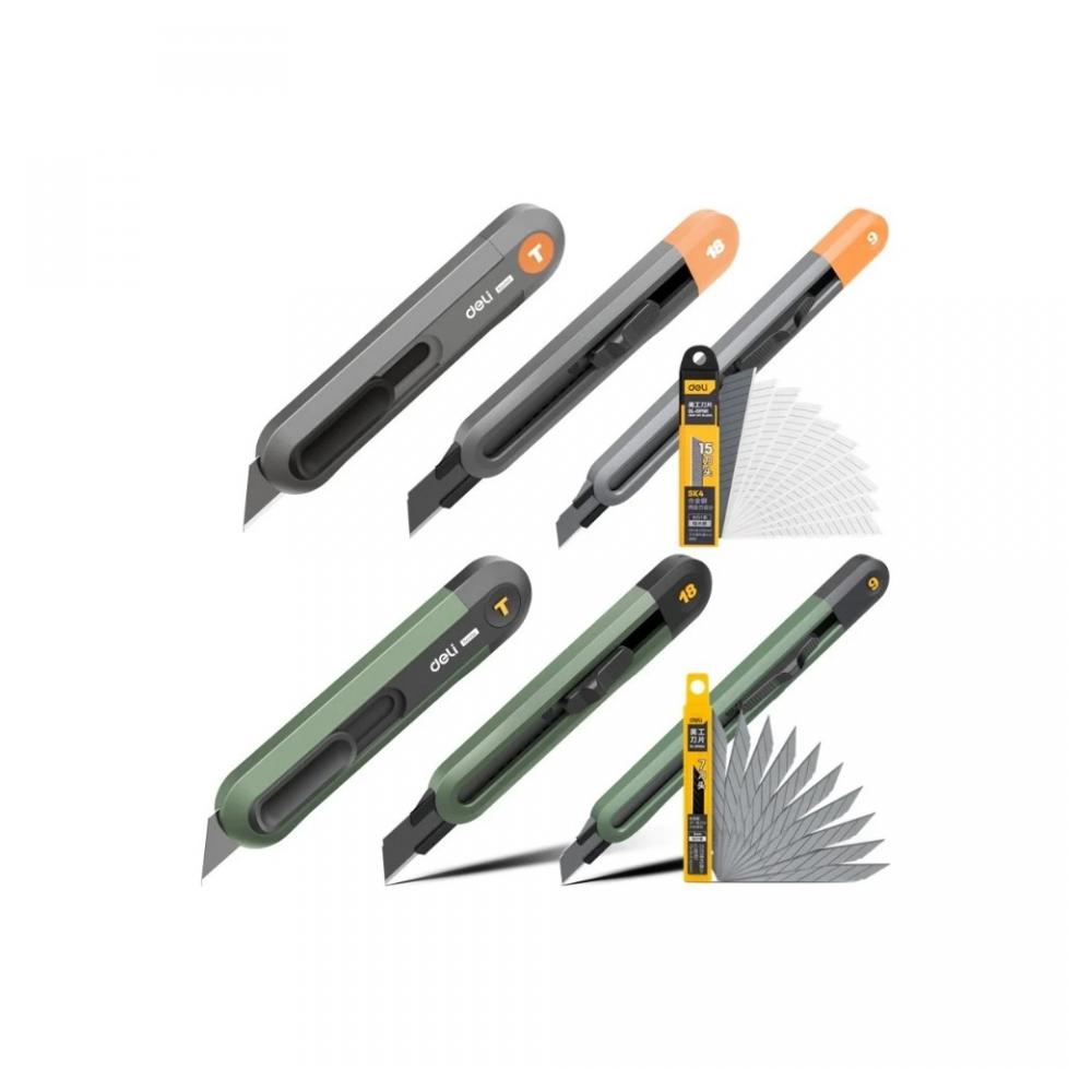 Технический нож "Home Series Black" Deli HT4009 (сегментированное черное лезвие 9мм, эксклюзивный дизайн, корпус из высококачественного софттач пластика) применяется для реза бумаги, картона, линолеума и других материалов. Лезвие выполнено из качественной стали SK2, благодаря чему отличается исключительной надежностью и остротой и легко меняется при необходимости. Корпус со специальным покрытием Soft Touch обеспечивает комфортную эксплуатацию, стойкость к атмосферным явлениям и образованию сколов и трещин. Эксклюзивный дизайн - изящный, но одновременно строгий и современный - уделяет внимание каждой детали. Нож упакован в стильную картонную коробку и будет отличным подарком для любителей качественного, современного инструмента.