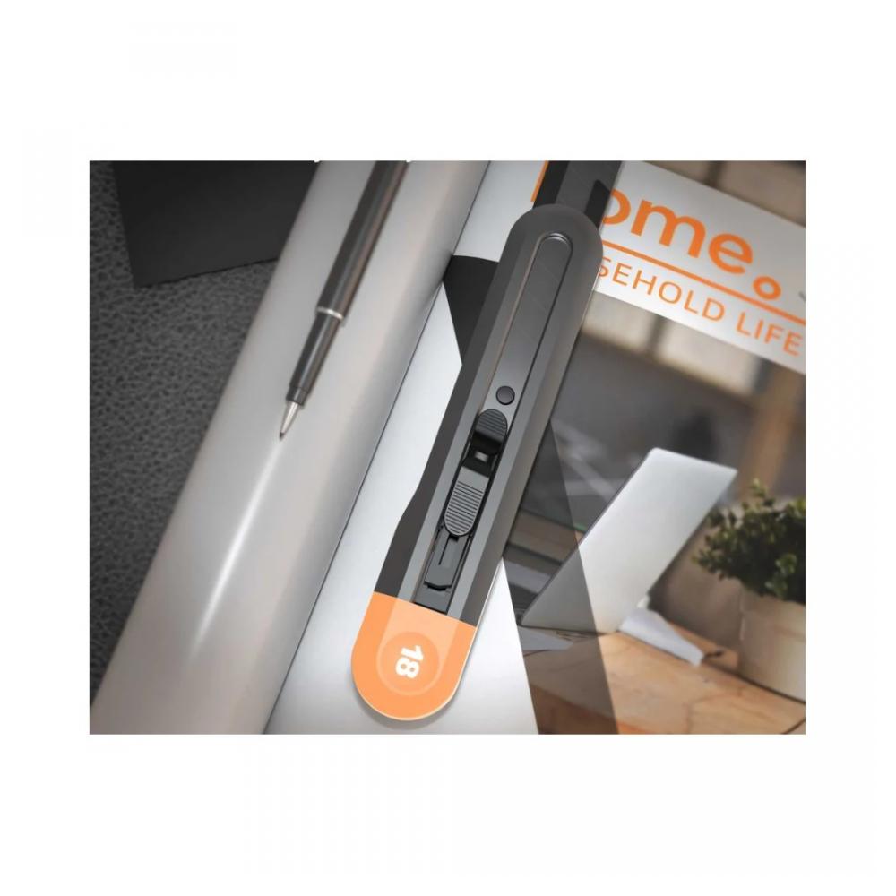 Технический строительный нож "Home Series Black" Deli HT4018 (сегментированное черное лезвие 18мм, эксклюзивный дизайн, корпус из высококачественного софттач пластика) применяется для реза бумаги, картона, линолеума и других материалов. Лезвие выполнено из качественной стали SK2, благодаря чему отличается исключительной надежностью и остротой и легко меняется при необходимости. Корпус со специальным покрытием Soft Touch обеспечивает комфортную эксплуатацию, стойкость к атмосферным явлениям и образованию сколов и трещин. Эксклюзивный дизайн - изящный, но одновременно строгий и современный - уделяет внимание каждой детали. Нож упакован в стильную картонную коробку и будет отличным подарком для любителей качественного, современного инструмента.
