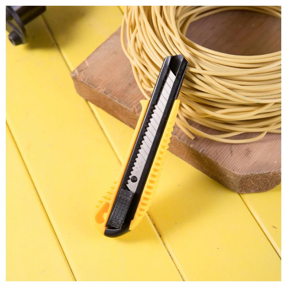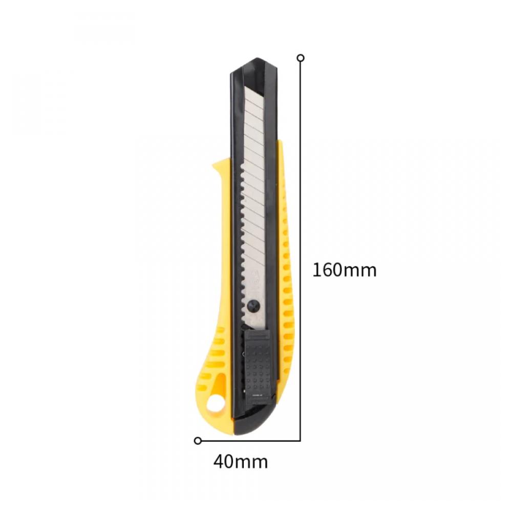 Технический нож DELI DL003 18 мм пригодится при проведении строительных, ремонтных, бытовых и прочих работ. Нож имеет двухступенчатое качественное лезвие из стали SK5, что обеспечивает высокое качество резки. Корпус из ABS пластика обладает прочностью и долговечностью. Кнопка блокировки лезвия служит для удобства работы. Технические характеристики: Материал лезвия - SK5 Выдвижное лезвие - есть Обрезиненная рукоять - нет Конструкция - выдвижной Складной - нет Габариты без упаковки - 160 x 40 мм Отделение для запасных лезвий - нет Фиксатор лезвий - защелка
