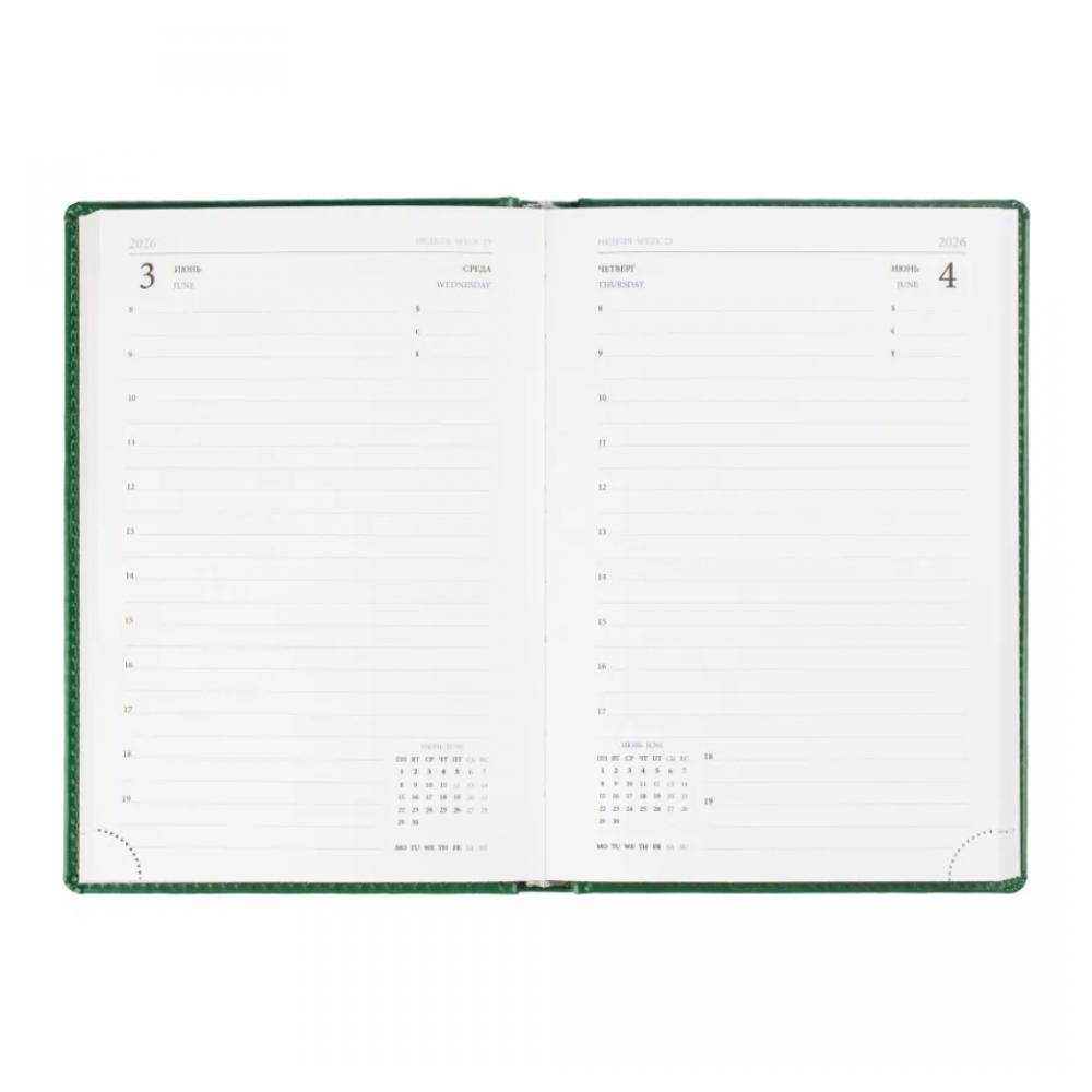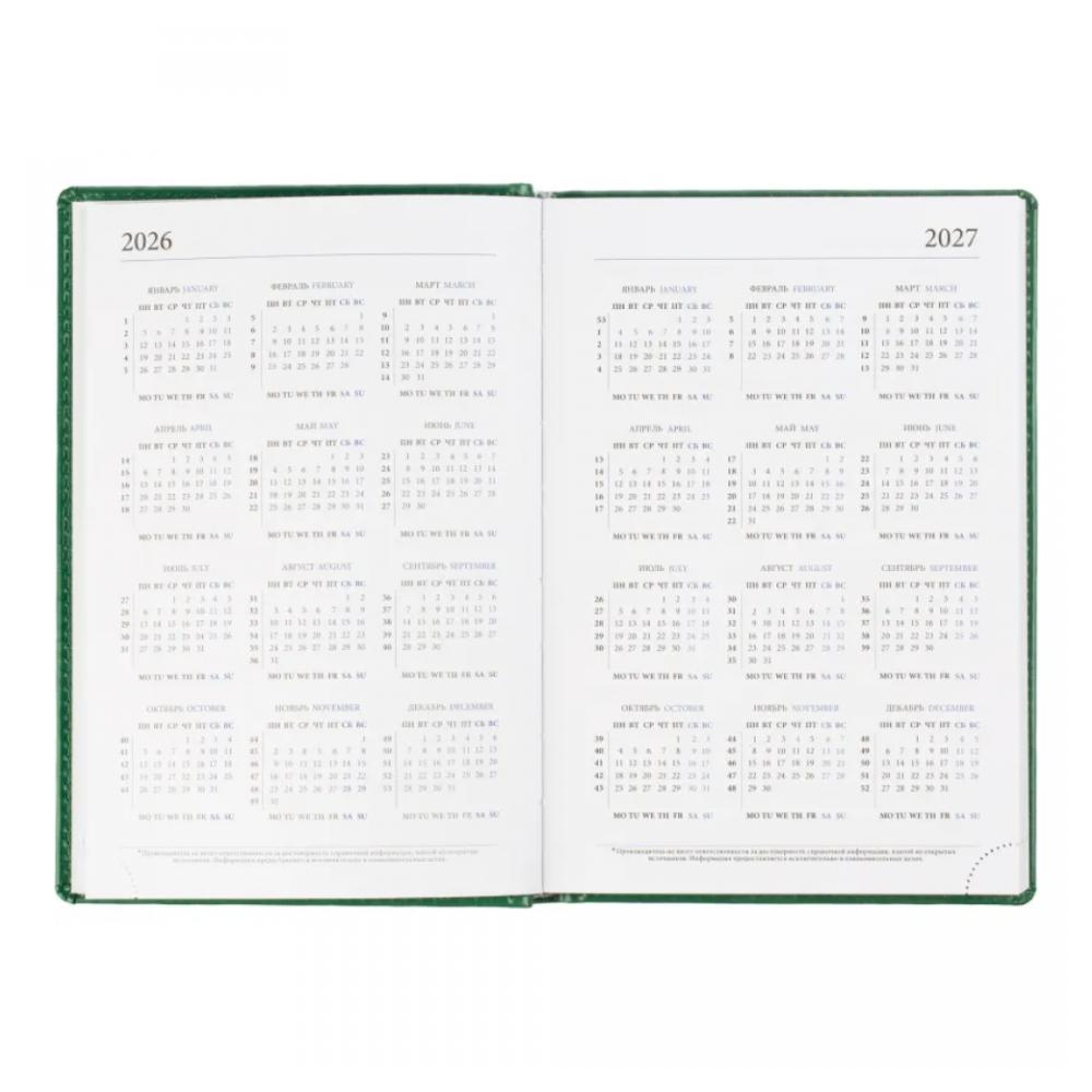 Ежедневник датированный на 2026 год Attache Agenda искусственная кожа А5 176 листов зелёный Это надёжный помощник для планирования и организации рабочего времени. Он идеально подходит для использования в офисе или на учёбе. Данный ежедневник имеет формат A5, содержит 176 листов. Твёрдая обложка с поролоном, выполненная из высококачественной искуственной кожи зелёного цвета, придает изделию элегантный и профессиональный вид. Страницы выполнены из белой офсетной бумаги плотностью 70 г/кв.м. Дизайн обложки: универсальный. Тип крепления — сшивка. Печать блока в 2 краски. Вид линовки — линейка. Размер: 14.8×21.8 см. Среди дополнительных характеристик — ляссе серебристого цвета и уникальный блок, выполненный в двух цветах. На страницах предусмотрен календарь на 2026-2027 гг., что позволяет удобно планировать мероприятия и торжественные даты. Ежедневник содержит информационно-справочный блок, включая личные данные, праздники, дни рождения и полезные сервисы. Блок также оснащен местами для записи регулярных платежей, важных телефонов и различных измерений. Перфорация уголка упрощает использование и добавляет удобства. Возможность нанесения логотипа на обложку любым способ тиснения открывает дополнительные возможности для корпоративного использования. Ежедневник Attache — отличный выбор для тех, кто ценит практичность и стиль в повседневной жизни.