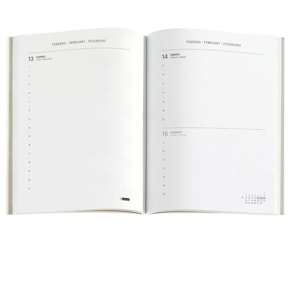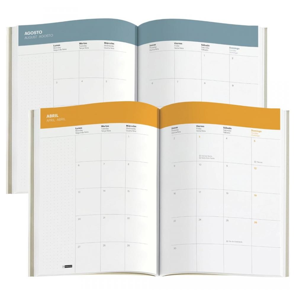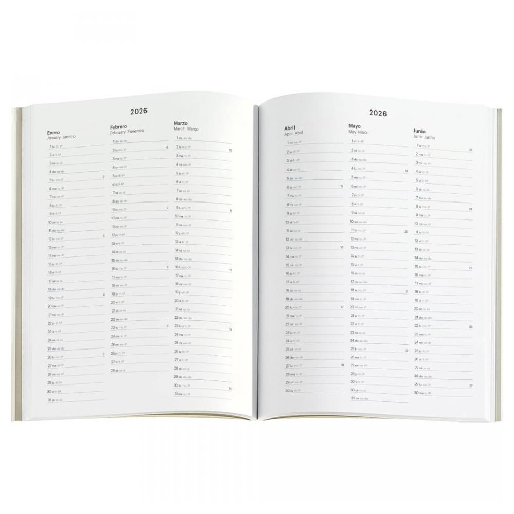 Дневник на 2026 год «Назад к основам» с ежедневным планированием на трёх языках (испанский, португальский, английский), включая выходные. Есть годовой и ежемесячный план на 2026–2027 годы с обзорами. Формат A5 (155×213 мм) — удобно писать и легко брать с собой. Бумага цвета слоновой кости, плотная и приятная на ощупь, сертифицированная FSC. Модель Back to Basics Navy Lines — с пурпурными тиснёными элементами и резиновым держателем для ручки. Стильный и практичный ежедневник.