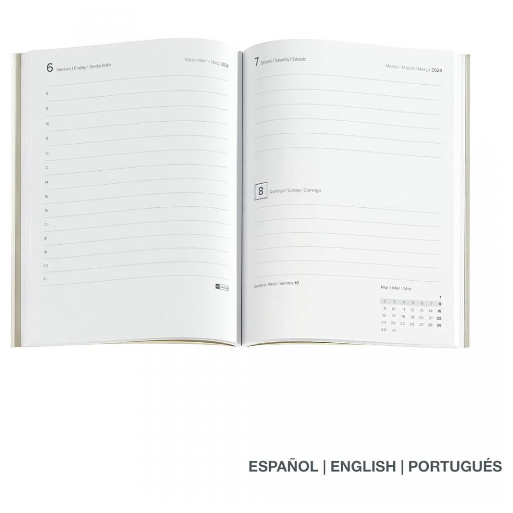 Организуйте свой день за днем в 2026 году с ежедневником Miquelrius из коллекции Basic Cuadros размером 122×168 мм, который идеально подходит для переноски. Гибкая обложка из прошитой искусственной кожи с гравировкой деталей сухим росчерком сочетает в себе элегантность и прочность. Формат «постранично» позволяет легко записывать задачи и встречи по порядку: с понедельника по пятницу на всю страницу, суббота и воскресенье – на всю. В комплект входят маркерная лента и резинка, бумага цвета слоновой кости плотностью 80 г/м², сертифицированная FSC, для комфортного и плавного письма. Кроме того, вы найдете календари, место для заметок и адресов, полезные значки и информацию о национальных праздниках Испании и Португалии. Ежедневник на нескольких языках: испанском, английском и португальском.