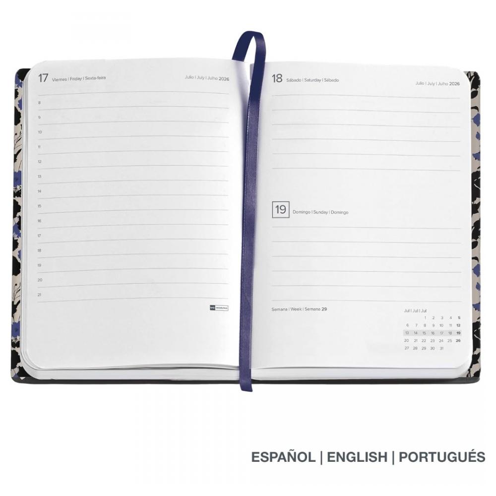 Ежедневник Miquelrius 2026 Day Per Page — идеальный помощник для тех, кто ежедневно подробно записывает свои планы. Компактный размер 122 x 168 мм позволяет носить его в любой сумке или рюкзаке, не жертвуя пространством для записей. Твёрдая матовая ламинированная обложка и прошитый переплёт сочетают в себе прочность и стиль. Сертифицированная FSC бумага цвета слоновой кости плотностью 80 г/м² обеспечивает гладкое письмо без размазывания. Включает внутренний карман, ленту-маркер, эластичную застёжку и резиновый держатель для ручки для дополнительного комфорта. Ежедневник доступен на испанском, английском и португальском языках, содержит полезные значки, а также национальные и португальские праздники. Идеально подходит для ежедневного контроля ваших задач и встреч в элегантном, портативном формате.