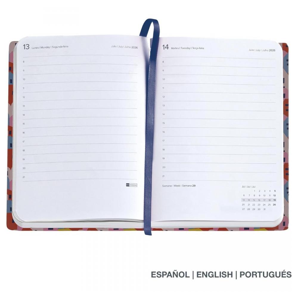 Ежедневник Miquelrius 2026 Day Per Page — идеальный помощник для тех, кто ежедневно подробно записывает свои планы. Компактный размер 122 x 168 мм позволяет носить его в любой сумке или рюкзаке, не жертвуя пространством для записей. Твёрдая матовая ламинированная обложка и прошитый переплёт сочетают в себе прочность и стиль. Сертифицированная FSC бумага цвета слоновой кости плотностью 80 г/м² обеспечивает гладкое письмо без размазывания. Включает внутренний карман, ленту-маркер, эластичную застёжку и резиновый держатель для ручки для дополнительного комфорта. Ежедневник доступен на испанском, английском и португальском языках, содержит полезные значки, а также национальные и португальские праздники. Идеально подходит для ежедневного контроля ваших задач и встреч в элегантном, портативном формате.