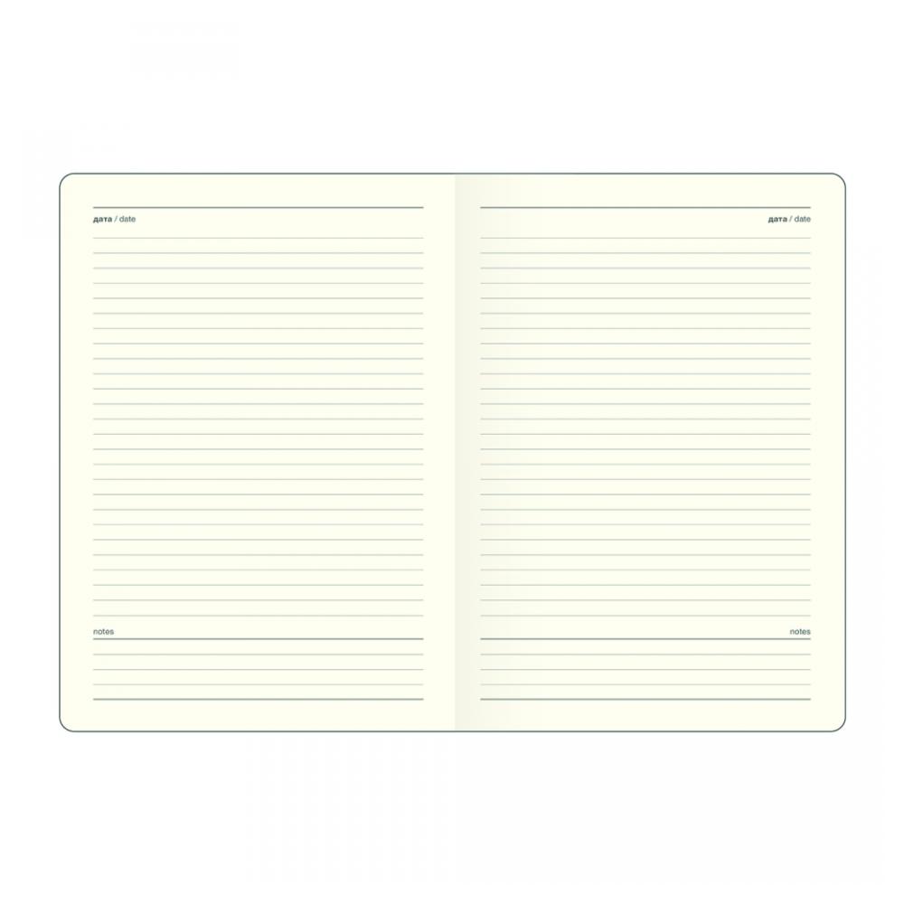 Обложка - твердая с резинкой, тактильно приятная искусственная кожа. Блок - линейка, 320 страниц, скругленные уголки, кармашек, 2 ляссе. Бумага: слоновая кость, скругленные уголки, 70 г/м2. Особенности: резинка и ляссе в цвет обложки, тиснение золотой фольгой и резинка для закрепления ручки.