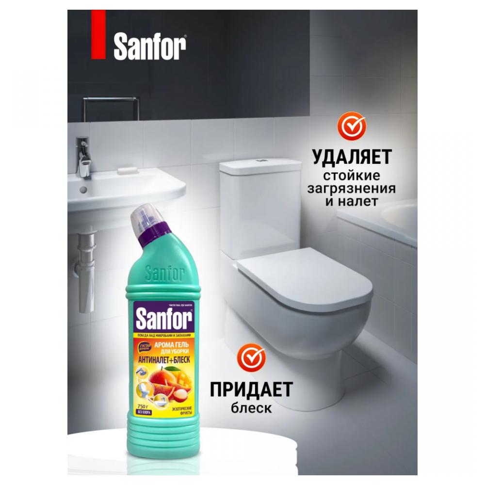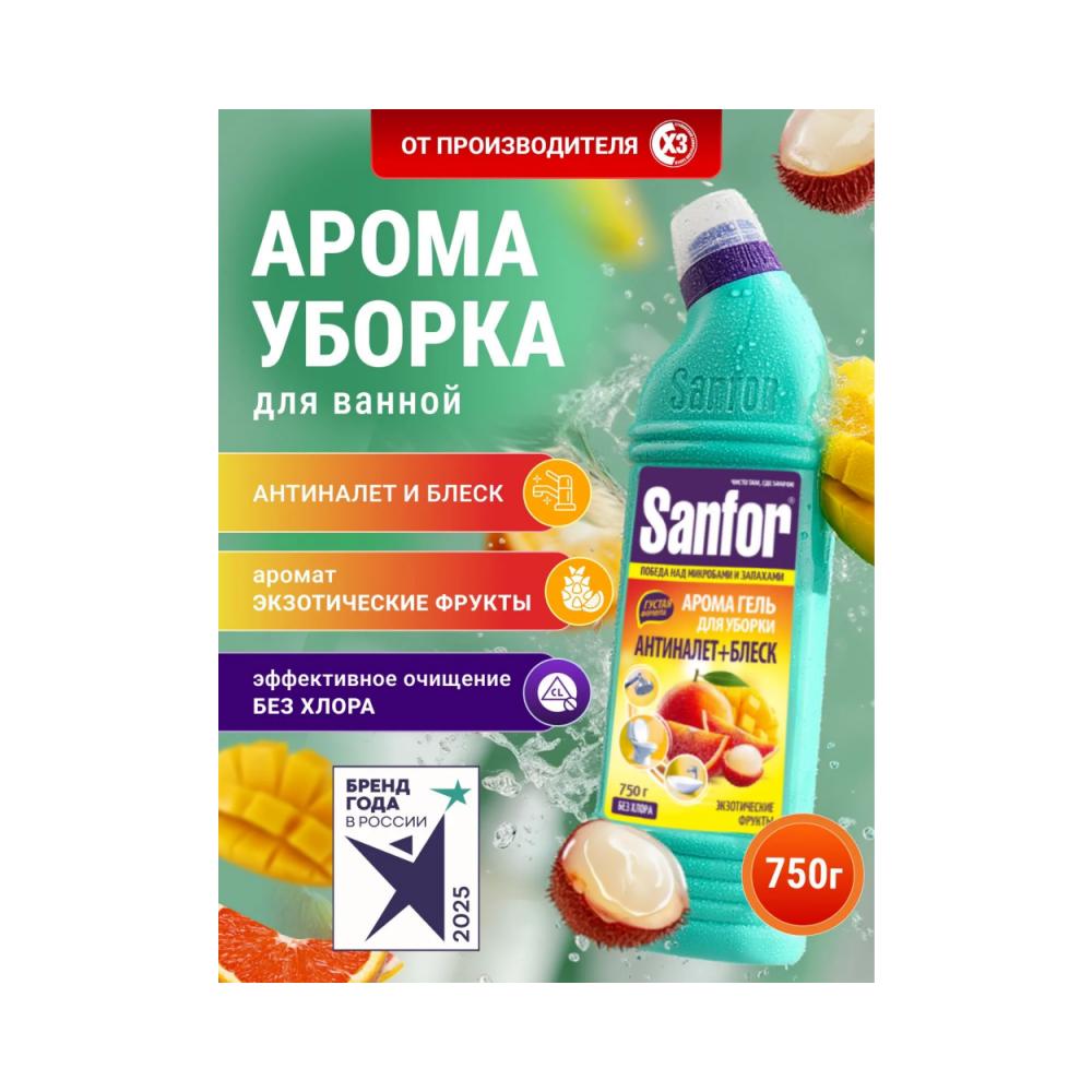 Средство предназначено для удаления известкового налета и стойких загрязнений с унитазов, писсуаров, раковин, ванн, смесителей, душевых кабин, кафельной плитки. Безопасен для хрома и акрила. Удаляет мыльный и известковый налет, придает блеск. Гель сочетает в себе эффективность и яркий аромат «Экзотические фрукты». Предназначен для ежедневной уборки. Способ применения: Унитазы, писсуары – нанести средство под ободок унитаза и распределить. Выдержать 30 минут, почистить и смыть водой. При необходимости обработку повторить. Раковины, смесители, краны и душевые кабины, кафельная плитка – обработать средством и смыть водой. Перед чисткой цветных акриловых или эмалированных ванн и раковин необходимо провести тест в незаметном месте на стойкость красителя, выдержав средство около 15 минут. Для достижения антимикробного действия средство выдержать не менее 60 минут, почистить и смыть водой. Не использовать для чистки поверхностей с поврежденной эмалью, из мрамора и природного камня. Состав: < 5 % лимонная кислота, < 5 % АПАВ, НПАВ, < 5 %: ароматизирующая добавка, консервант, краситель. Условия и сроки хранения: Хранить в недоступном для детей месте, в плотно закрытой упаковке изготовителя, отдельно от пищевых продуктов. Срок годности: 36 мес. Срок годности и дата изготовления указаны на упаковке.