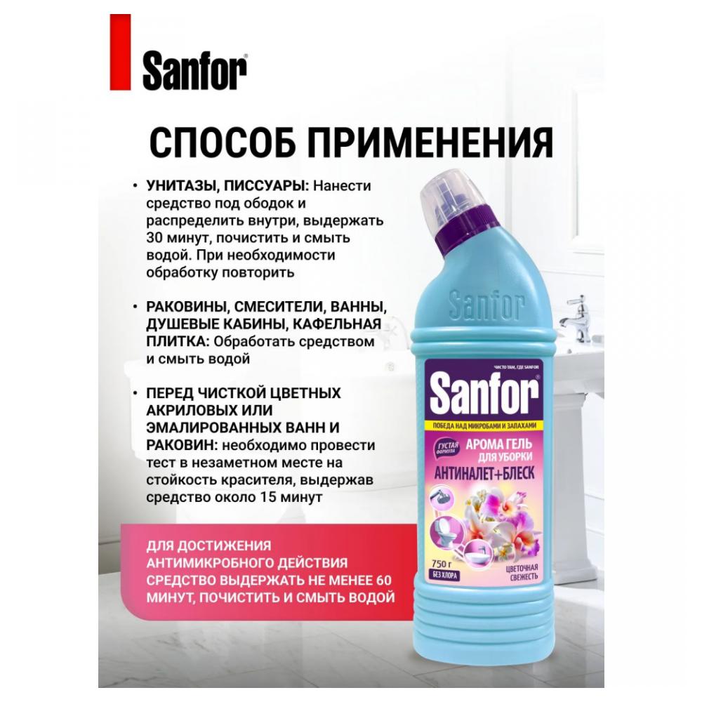 Средство предназначено для удаления известкового налета и стойких загрязнений с унитазов, писсуаров, раковин, ванн, смесителей, душевых кабин, кафельной плитки. Безопасен для хрома и акрила. Удаляет мыльный и известковый налет, придает блеск. Гель сочетает в себе эффективность и яркий аромат «Цветочная свежесть». Предназначен для ежедневной уборки. Способ применения: Унитазы, писсуары – нанести средство под ободок унитаза и распределить. Выдержать 30 минут, почистить и смыть водой. При необходимости обработку повторить. Раковины, смесители, краны и душевые кабины, кафельная плитка – обработать средством и смыть водой. Перед чисткой цветных акриловых или эмалированных ванн и раковин необходимо провести тест в незаметном месте на стойкость красителя, выдержав средство около 15 минут. Для достижения антимикробного действия средство выдержать не менее 60 минут, почистить и смыть водой. Не использовать для чистки поверхностей с поврежденной эмалью, из мрамора и природного камня. Состав: < 5 % лимонная кислота, < 5 % АПАВ, НПАВ, < 5 %: ароматизирующая добавка, консервант, краситель. Условия и сроки хранения: Хранить в недоступном для детей месте, в плотно закрытой упаковке изготовителя, отдельно от пищевых продуктов. Срок годности: 36 мес. Срок годности и дата изготовления указаны на упаковке.