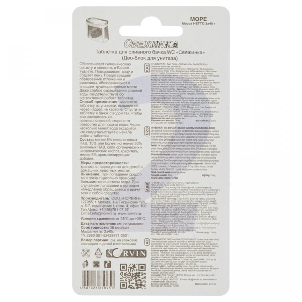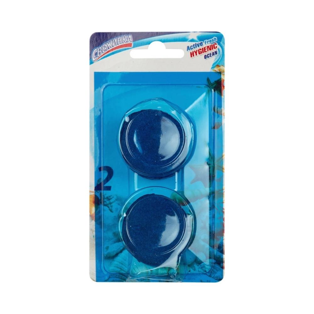 Таблетка для сливного бачка Свежинка Море 40 г 2 штуки в упаковке. Уничтожает бактерии, дезодорирует поверхность, препятствует отложению водного и мочевого камня, предотвращает появление ржавчины на стенках унитаза. Постепенно растворяясь в воде, она образует на поверхности унитаза защитную пленку, которая препятствует дальнейшему быстрому загрязнению. Способ применения: Извлечь таблетку из упаковки через надрез на картоне. Опустить ее в бачок так, чтобы она находилась на противоположной стороне от отверстия подачи воды. Через несколько минут вода окрасится – значит, таблетка работает. Меры предосторожности: использовать только по назначению. Хранить в недоступном для детей и домашних животных месте. Состав: 5% неионогенных ПАВ, 15% и более, но не менее 30% анионных ПАВ, соли органических и неорганических кислот, краситель менее 5%, ароматизатор. Условия хранения: Хранить при температуре от -35 °C до +35 °C в сухом месте, вдали от пищевых продуктов. Срок годности: 3 года с даты изготовления при соблюдении условий хранения.