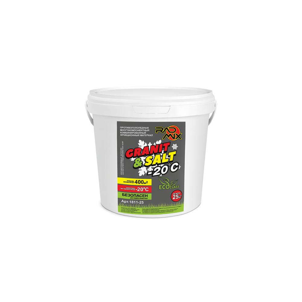 Противогололедный материал RadMix Granit & Salt. Экологически чистый. Применяется там, где важно не навредить растительности. Состав: хлористый натрий, гранитная крошка 2,5-5 мм, функциональные добавки: биофильная, антислеживатель, ингибитор коррозии. Не содержит тяжелых металлов и других вредных для людей и животных примесей. Гранитная крошка обеспечивает хорошее сцепление поверхности обуви и колес с дорогой, а за счет соли снег и лед тает на порядок быстрее. Основная задача заключается в предотвращении образования на поверхности дороги ледяной корки. К тому же состав ускоряет процесс таяния выпавшего снега. Обрабатывается дорожное покрытие и тротуары вручную или при помощи специального транспорта. Рекомендуется осуществлять обработку перед снегопадом. В таком случае смесь будет максимально полезной. Следует отметить, что если температура на улице опустилась ниже -20°C, то соль становится бесполезной и работает только лишь гранитная крошка. Основное преимущество – отсутствие грязи при таянии снега, как это бывает с пескосолью. Рабочая температура С - от 0 до - 20 Условия и сроки хранения: Реагент следует хранить в условиях, исключающих нарушение целостности упаковки и проникновение влаги. До начала использования не допускается продолжительный контакт препарата с воздухом. Температурный режим хранения не ограничен. Хранить в недоступном для детей месте. Срок годности: 12 месяцев с даты изготовления при соблюдении условий хранения.