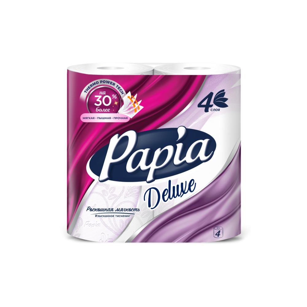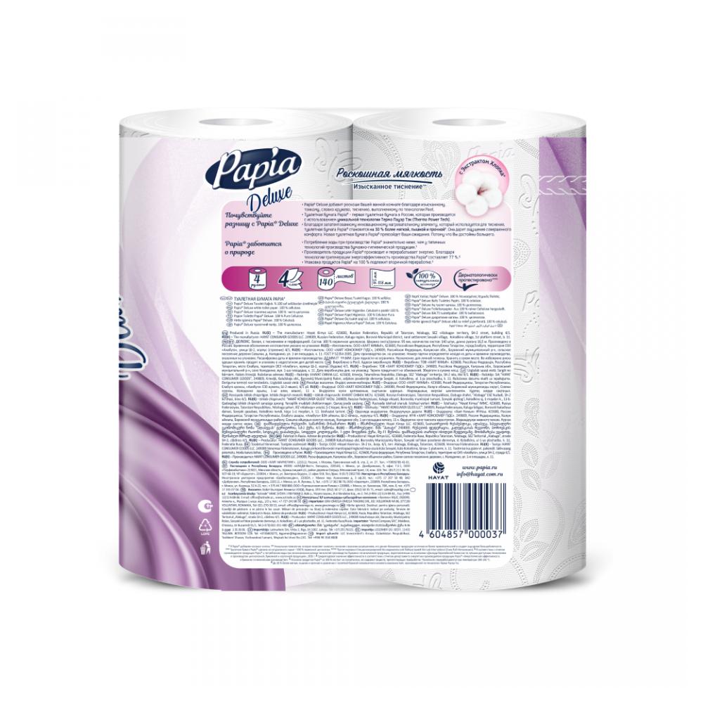 Туалетная бумага Papia Deluxe четырехслойная белая с тиснением и перфорацией. Уникальная итальянская технология изысканного кружевного тиснения Pixel, разработанного специально для Papia, делает бумагу не только более эстетически привлекательной, но и более приятной на ощупь. Двустороннее тиснение бумаги обеспечивает лучшую впитываемость и мягкость с обеих сторон. Характеристики: Длина рулона: 16,5 м. Ширина рулона: 9,5 см. Количество листов: 140. Длина листа: 11,8 см. Слойность: 4. Материал: 100% целлюлоза. Тиснение: да. Цвет: белый. Условия и сроки хранения Хранить в закрытых помещениях, защищенных от атмосферных осадков и почвенной влаги, на расстоянии не менее 1 м от отопительных устройств. Срок годности не ограничен.
