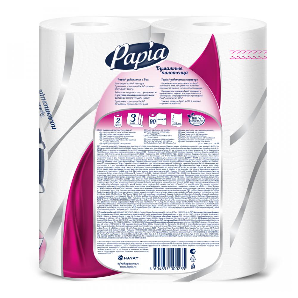 Полотенца бумажные Papia – Ваш практичный и гигиеничный помощник на кухне и дома. Прочные и впитывающие трехслойные бумажные полотенца Papia. Перфорация на пол-листа позволяет более эффективно контролировать расход полотенец, отрывая ровно столько, сколько нужно. Характеристики: Длина рулона: 10,8 м. Количество листов: 90. Длина листа: 12 см. Ширина листа: 22,7 см. Слойность: 3. Материал: 100% целлюлоза. Тиснение: да. Цвет: белый. Условия и сроки хранения: Хранить в закрытых помещениях, защищенных от атмосферных осадков и почвенной влаги, на расстоянии не менее 1 м от отопительных устройств. Срок годности не ограничен.