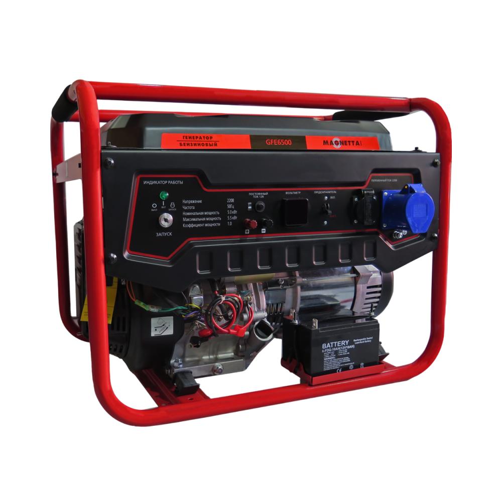 Magnetta GFE6500 — это мощный бензиновый генератор, предназначенный для надёжного резервного электроснабжения в бытовых и профессиональных условиях. Он идеально подходит для использования на даче, в частном доме, на строительной площадке или в мастерской. Благодаря высокой производительности и продуманной конструкции, устройство обеспечивает стабильную подачу энергии даже при интенсивной нагрузке. Генератор оснащён медной обмоткой альтернатора, что гарантирует долговечность и высокую эффективность работы. Многофункциональный цифровой дисплей отображает ключевые параметры — напряжение, частоту и моточасы, позволяя контролировать процесс эксплуатации. Устройство имеет розетки на 16 А и 32 А, выход постоянного тока 12 В, а также предохранитель. Система автоматического отключения при низком уровне масла защищает двигатель от перегрузок, а низкий уровень шума и экономичный расход топлива делают использование максимально комфортным. Технические характеристики: Тип топлива: бензин Тип стартера: ручной Автоматический ввод резерва (АВР): опционально Номинальная мощность: 5 кВт Максимальная мощность: 5.5 кВт Частота тока: 50/60 Гц Напряжение сети: 220–230 В Количество фаз: 1 Тип двигателя: 1-цилиндровый, 4-тактный, воздушного охлаждения Рабочий объем двигателя: 389 см³ Объем смазочного масла: 1.1 л Объем топливного бака: 25 л Минимальный расход топлива: 313 г/кВт·ч Непрерывное время работы: до 10 часов Уровень шума: 74 дБ Габаритные размеры: 695 × 530 × 560 мм Вес: 82 кг