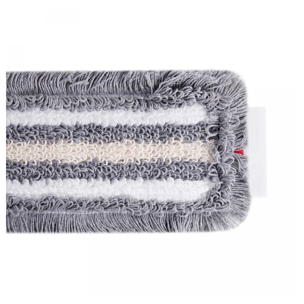 Cерая пряжа делает моп менее марким при длительной эксплуатации, а белые вставки из микроволокна позволяют следить за степенью загрязнения мопа. Отлично зарекомендовал себя при использовании на генеральных уборках, после строительных работ, а также при ежедневной поддерживающей уборке. Хорошо скользит по полу, легкий в работе. Ряды петель плотно прилегают друг другу, исключая истирание рабочей поверхности. Благодаря тому, что во время крашения серые волокна проходят термическую обработку, из них уже удалены основные масляные пропитки, и этот моп имеет максимальное влагопоглощение уже при первой эксплуатации.