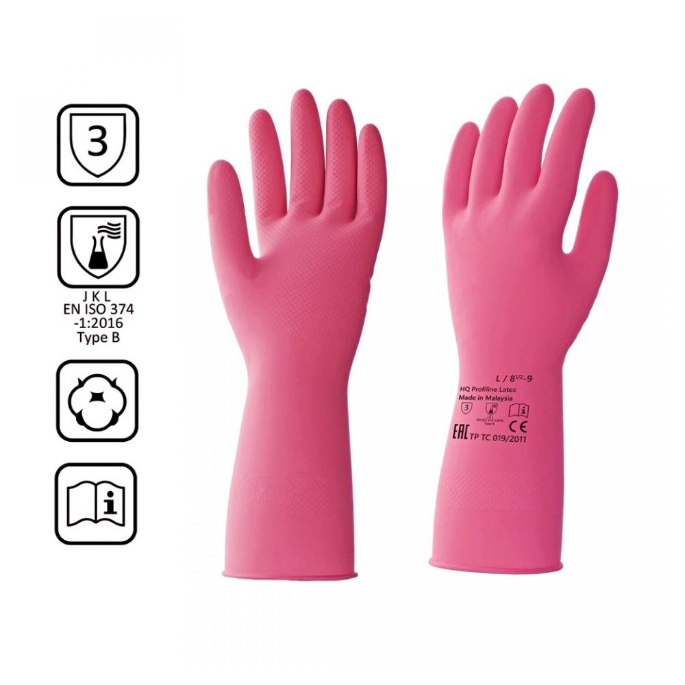 Перчатки латексные для защиты от химических воздействий (класс защиты В) и общих производственных загрязнений. Химически стойкие. Внутреннее покрытие из хлопка обеспечивает комфорт во время работы. Перчатки защищают руки от загрязнений, воздействия растворов моющих средств на основе щелочей и кислот и может вызвать аллергические реакции. Особенности и преимущества: Есть цветовая кодировка для предотвращения перекрёстного загрязнения; Латекс прочный и эластичный, что обеспечивает перчаткам износостойкость и долговечность; Удобная анатомическая посадка на руке; Есть ролик на манжете, что облегчает надевание перчатки на руку (надевающая рука не соскальзывает по манжете); Хлопковое напыление создаёт комфорт при работе, помогает легко надевать и снимать перчатку и впитывает излишнюю влагу; Есть рельеф на ладони и пальцах для надежного захвата; Хорошая устойчивость к средствам содержащим кислоты и щёлочь (класс защиты B - J – гептан, K- гидроокись натрия (щелочь), L – серная кислота). Область применения: Для защиты рук во время уборки помещений; Можно применять при сухой и влажной уборке; Есть защита от кислот и щелочей, можно использовать с разведенными моющими средствами и дезинфектантами. Состав: 70 % натуральный латекс, 30 % добавки. Длина: 30 см +/- 0,5 см. Толщина: 0,30 - 0,35 мм. Ширина ладони: M – 10 ±0,5 см, L – 11 ±0,5 см. Вес пары: M – 50±3 г. L – 55±3 г. Условия и сроки хранения: Хранить в затемненных помещениях при температуре от 0°С до +30 °С и относительной влажности воздуха 80-70% на расстоянии не менее 1 метра от отопительных приборов. Условия эксплуатации: использовать только по назначению. Избегать контактов с маслами, смазочными материалами и производными углеводородов. Перед началом использования убедитесь, что перчатки подходят для выбранных целей. Срок хранения (годности): 5 лет с даты изготовления. Срок службы: 1 год с момента первого использования (с учетом правильного хранения) и в любом случае не может превышать 5 лет с момента изготовления. Дата изготовления указаны на упаковке.
