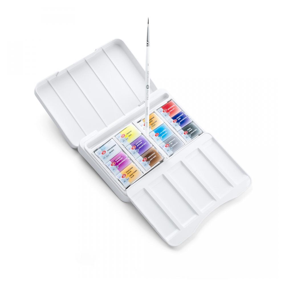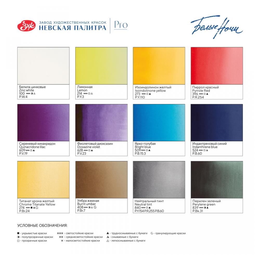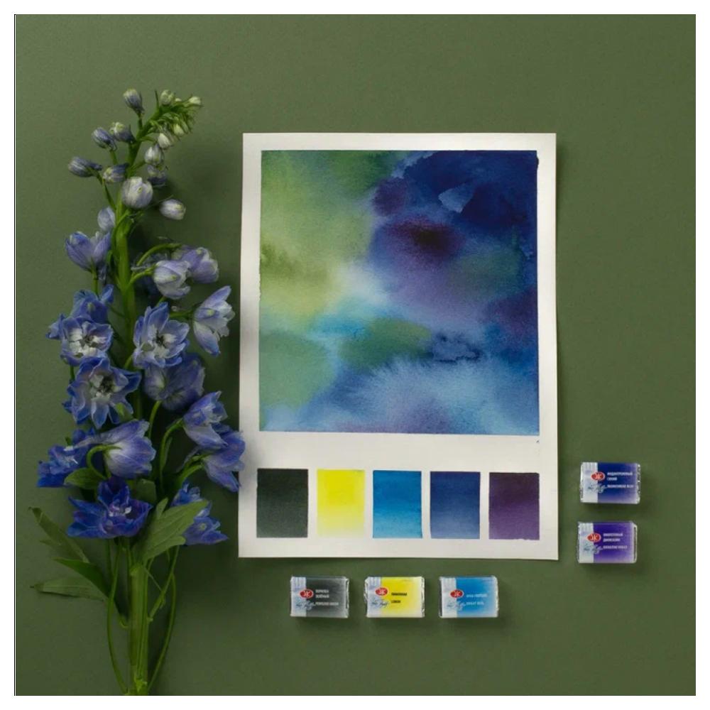 Набор акварели «Ботанический атлас» — это идеальный инструмент для художников, работающих в жанре ботанической живописи. Созданный для изображения цветов и ботанических мотивов, этот набор открывает перед художниками возможности для работы с тончайшими цветовыми переходами, мягкими лессировками и глубокими, выразительными природными текстурами. Палитра набора: 100 Белила цинковые | 214 Лимонная | 273 Изоиндолинон жёлтый | 396 Пиррол красный | 609 Сиреневый хинакридон | 628 Фиолетовый диоксазин | 509 Ярко-голубая | 524 Индантреновый синий | 274 Титанат хрома жёлтый | 408 Умбра жженая | 840 Нейтральный тинт | 839 Перилен зелёный Набор комплектуется в компактный пластиковый пенал со съемной палитрой и отделением для дорожной кисти. Съемные кассеты для кювет облегчают уход за пеналом. Кюветы объемом 2,5мл. Профессиональные художественные акварельные краски «Белые ночи» представляют собой тонкодисперсные суспензии пигментов и наполнителей в связующем, в состав, которого входит водный раствор растительного клея – гуммиарабика. Высокая концентрация пигмента обеспечивают максимальную интенсивность цветового тона акварели. Насыщенность сохраняется даже при разбавлении большим количеством воды. Отличаются прозрачностью, что дает возможность художнику работать тонкими лессировками. Чистые цвета позволяют писать в смесях и получать богатое многообразие оттенков. Все оттенки палитры набора обладают максимальным показателем светостойкости, это обеспечивает долговременною сохранность цвета в завершенных работах. Состав красок: пигмент, наполнитель, гуммиарабик, вода, добавки.