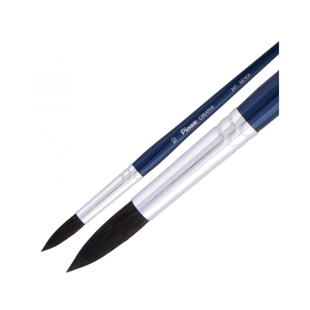 Кисти изготовлены из японской синтетики, имитирующей волос белки. Очень мягкий, заостренный на концах волос идеален для акварельной живописи благодаря способности хорошо удерживать и отдавать воду. Конусообразная форма пучка позволяет прорисовывать мелкие детали и выполнять заливку фона. Синтетическое сырье делает эти кисти более прочными и долговечными по сравнению с натуральными беличьими кистями. Кисти выпускаются с короткой ручкой синего цвета, самой популярной среди акварелистов.
