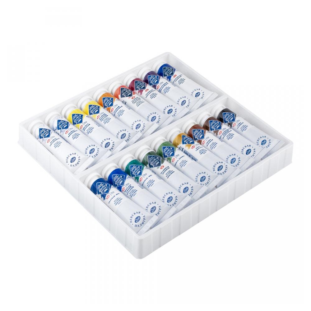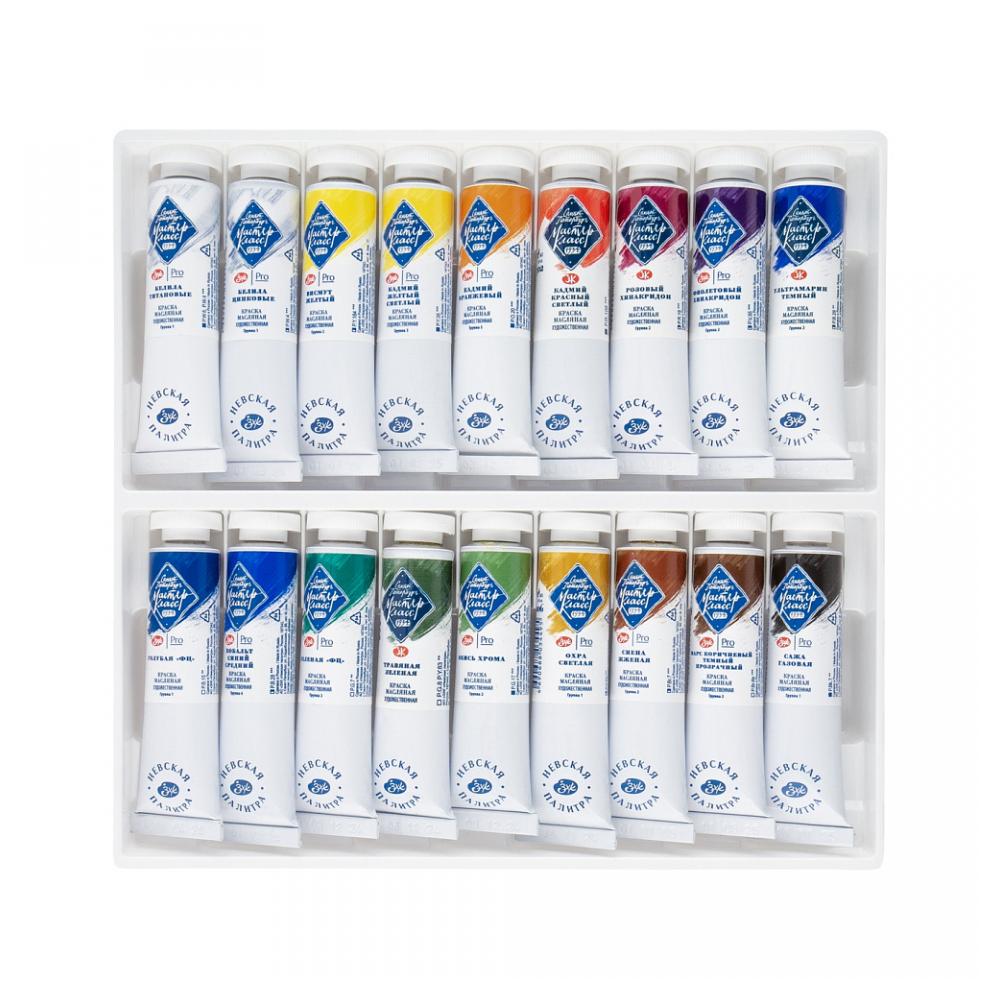 Масляные краски «Мастер-класс» разработаны для профессиональных художников. Изготавливаются по традиционным рецептурам на основе высококачественных пигментов, связующего – специально обработанного льняного масла и натуральных смол, положительным образом влияющих на свойства красок. Тонкодисперсные краски с высокой концентрацией пигмента превосходно смешиваются между собой. Обладают густой консистенцией, позволяющей работать пастозно. Яркость и чистота цвета, высокая светостойкость красок обусловлены применением ценных для живописи неорганических (природные красящие земли, кадмиевые, кобальтовые, железоокисные) и органических пигментов высокого качества. 2 вида белил с составе набора; 16 оттенков из18-ти - монопигментные; натуральные кадмии и кобальт в составе набора; 13 оттенков из 18-ти обладают максимальной светостойкостью; в наборе представлены как укрывистые, так и лессировочные цвета. Состав набора: 101 Белила титановые | 100 Белила цинковые | 272 Висмут желтый | 200 Кадмий желтый светлый | 304 Кадмий оранжевый | 302 Кадмий красный светлый | 324 Розовый хинакридон | 621 Фиолетовый хинакридон | 521 Ультрамарин темный | 500 Голубая «ФЦ» | 505 Кобальт синий средний | 703 Зеленая ФЦ | 716 Травяная зеленая | 704 Окись хрома | 206 Охра светлая | 406 Сиена жженая | 404 Марс коричневый темный прозрачный | 801 Сажа газовая