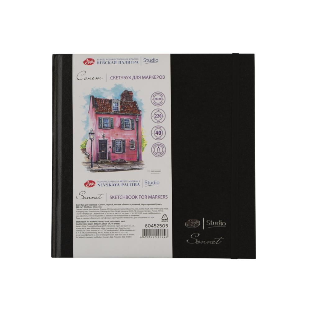 Скетчбук для маркеров "Сонет" 20*20 см, 220 г/м2, 40 л., черный, на резинке, двухсторонняя бумага