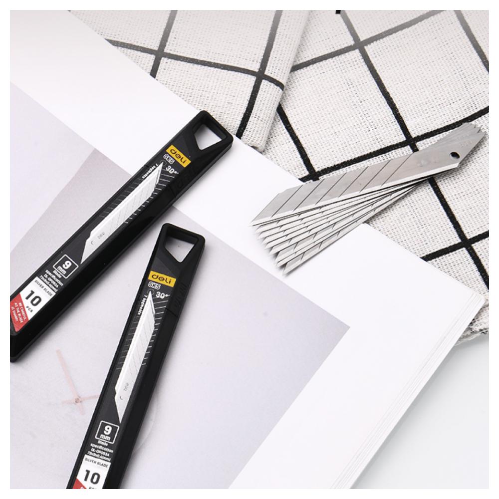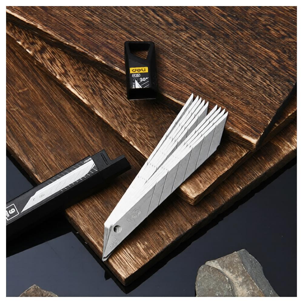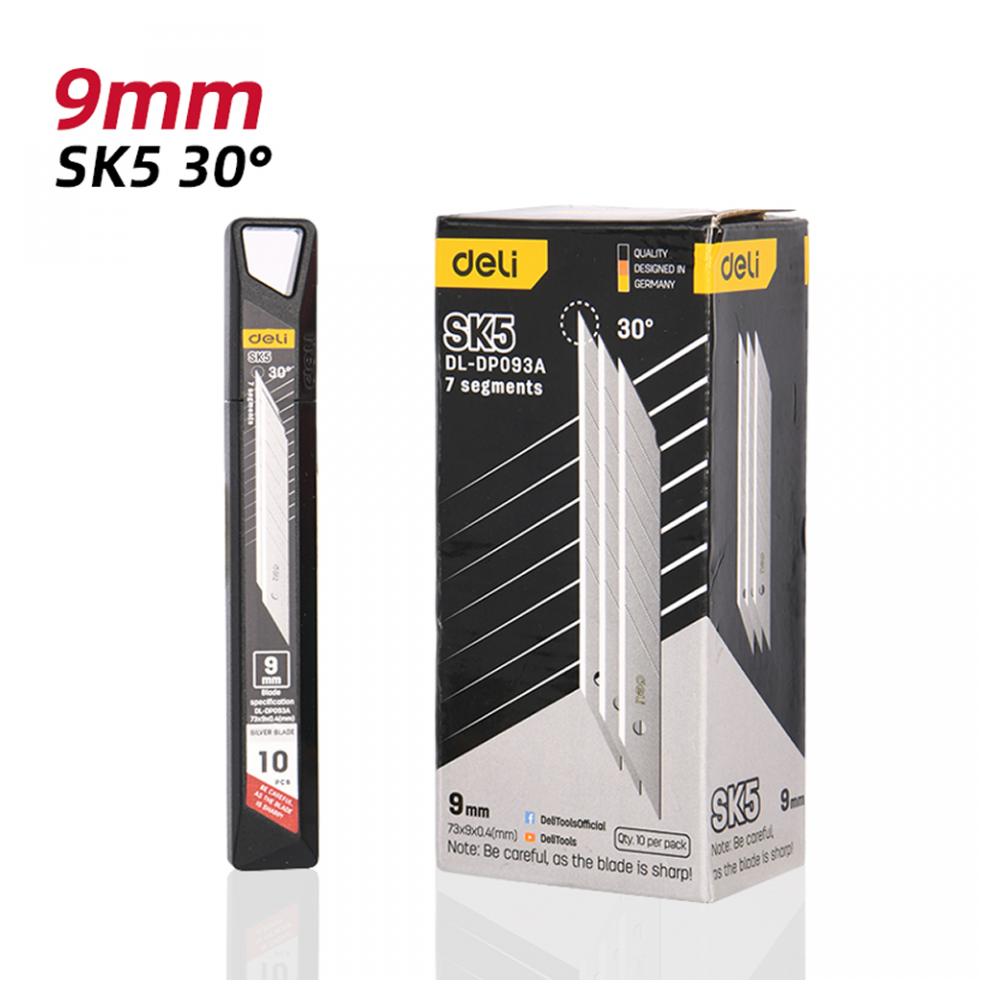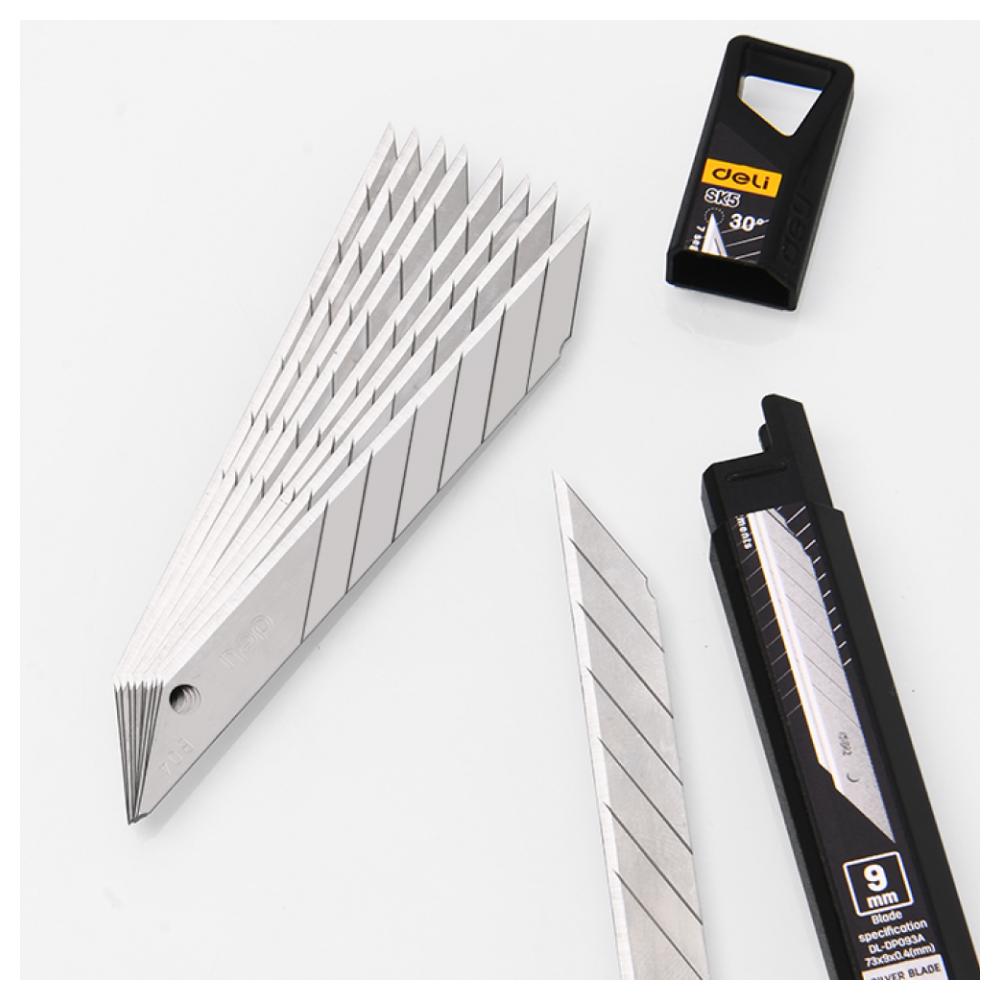 Лезвие для строительного ножа "Deli SK5" 9 мм, 10 шт. Материал: сталь SK5 10 лезвий в комплекте Ширина лезвия: 9 мм Упаковано в пластиковый блистер Высокотемпературная закалка, антикоррозийное покрытие. 7 сегментов
