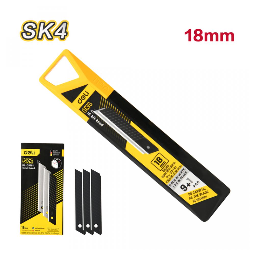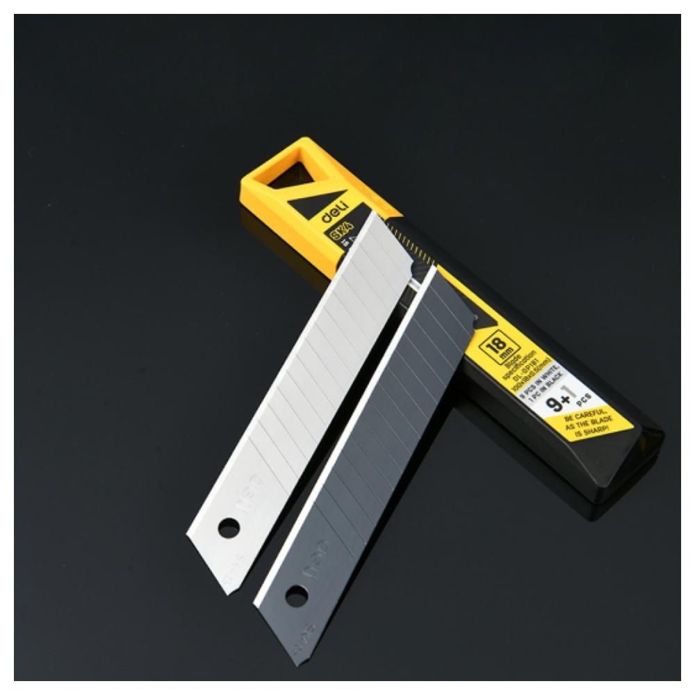 Лезвия изготовлены из высококачественной стали SK4, что увеличивает срок их службы на 50%. Благодаря термообработке обеспечивается превосходная твёрдость и устойчивость к износу. Антикоррозийное покрытие защищает поверхность от ржавчины и продлевает срок эксплуатации. В комплект входит 1 чёрное и 9 серебристых лезвий, что делает набор универсальным для различных задач. Упакованы в цветную коробку. Тип лезвия сегментированное Серия Yellow Series (Deli) Ширина лезвия (мм) 18