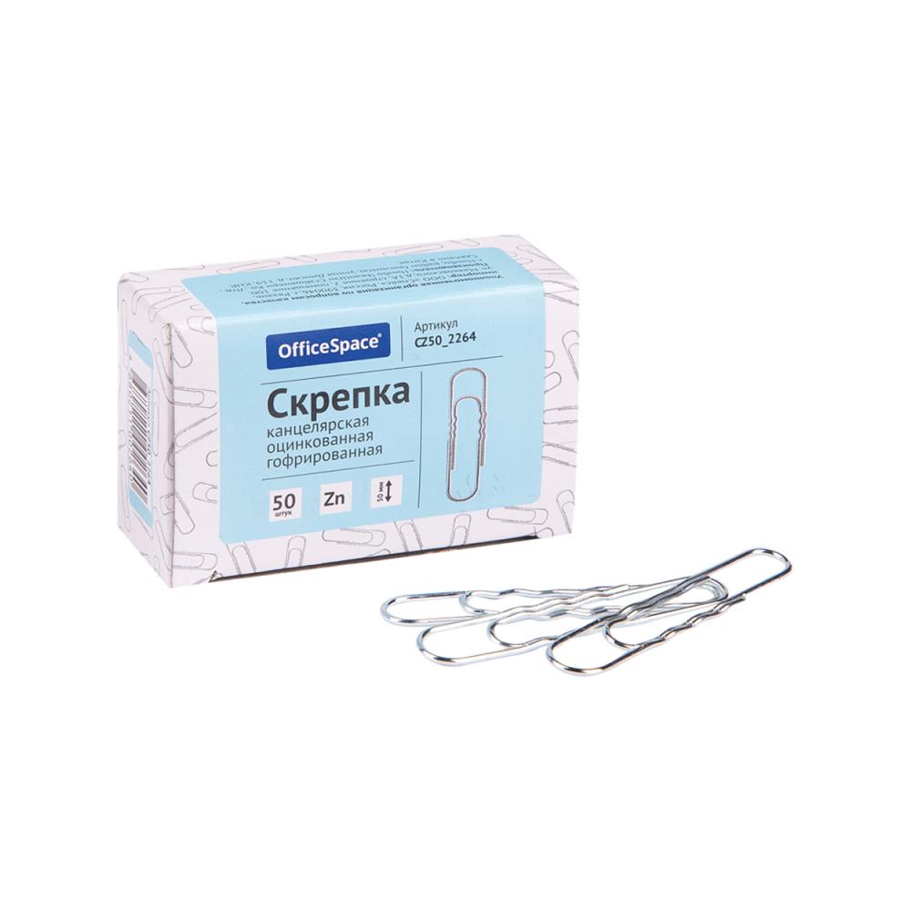 Оцинкованные канцелярские гофрированные скрепки "OfficeSpace" овальной формы. Отличный инструмент для работы с документами, не пачкают и не деформируют бумагу, не ржавеют, надежно скрепляют документы. Упакованы в картонную коробку по 50 шт. Длина - 50 мм. Цвет – серебристый.