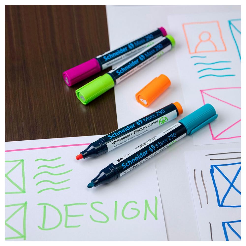 Маркер для белых досок и флипчартов с круглым наконечником, ширина линии 2-3 мм. Корпус маркера на 95% состоит из переработанного пластика. Будь то на доске или на бумаге, насыщенные, яркие цвета легко читаются даже из дальнего конца комнаты. Чернила можно удалить с белой доски сухой тканью, не оставляя следов, и они не будут просачиваться на нижнюю страницу флипчарта. Чернила не высыхают даже при снятом колпачке в течение 2-3 дней. Он имеет слабый запах и не содержит толуола и ксилола. Новый формат увеличенного объема содержит больше чернил для максимальной производительности письма, а новый пулевидный наконечник пишет мягко и без скрипа. Maxx 290 имеет практичную крышку с зажимом и может быть заправлен с помощью заправочной станции Maxx 665.