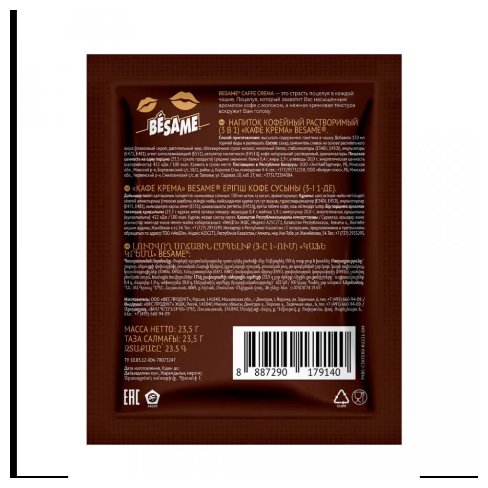 Растворимый кофе в пакетиках Besame Caffe Crema 3 в 1 это смесь натурального растворимого кофе, сливок и сахара. Mi amor es el cafe - Моя любовь - это кофе! Кофейный напиток Бесаме Кафе Крема - это страсть поцелуя в каждой чашке. Поцелуя, который захватит Вас насыщенным ароматом кофе с молоком, а нежная кремовая текстура вскружит Вам голову. Caffè cremа - переводится как «кофе со сливками». Впитал в себя лучшее от рецептов кортадо и кон лечче – самых популярных рецептов приготовления кофе с молоком Испании. Уникальный контраст эспрессо и нежного молока. Каждый пакетик кофе Бесаме крема 3 в 1 содержит классическую комбинацию из трех заботливо смешанных компонентов: кофе, сливки и сахар. Нежная аппетитная пенка в сочетании с великолепным насыщенным вкусом кофе растворимый из специально отобранных кофейных зерен дарят истинное наслаждение. Чтобы приготовить сладкий сливочный кофе, вам потребуются только чашка и вода. Высыпьте содержимое пакетика в чашку, добавьте горячей воды и размешайте. Одна упаковка содержит 20 пакетиков с кофе. Состав: Сахар, заменитель сливок на основе расти тельного жира, кофе натуральный растворимый, ароматизаторы. Энергетический состав на одну порцию (23,5 г сухого продукта) продукта: Белки: 0.4 г. Жиры: 1.9 г. Углеводы: 20.0 г. Энергетическая ценность: 422 ккал. Условия и сроки хранения: Хранить в сухом месте при комнатной температуре. Срок хранения и дата изготовления указаны на упаковке.