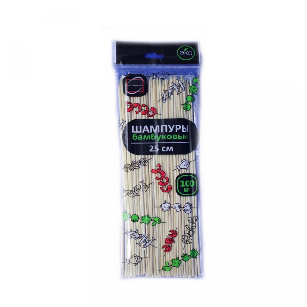 Набор шампуров 25 см (100 штук). Предназначены для приготовления мини-шашлычков из мяса, птицы, рыбы, овощей, для создания канапе. Незаменимы как на пикниках, так и в ежедневной готовке. Можно использовать в микроволновых и электропечах при температуре до 280 °С. Срок годности не ограничен. Длина – 250 мм. Материал – бамбук. Условия и сроки хранения: Хранить при температуре не выше +35°С в помещениях, защищенных от воздействия влаги. Срок годности не ограничен при соблюдении условий хранения.