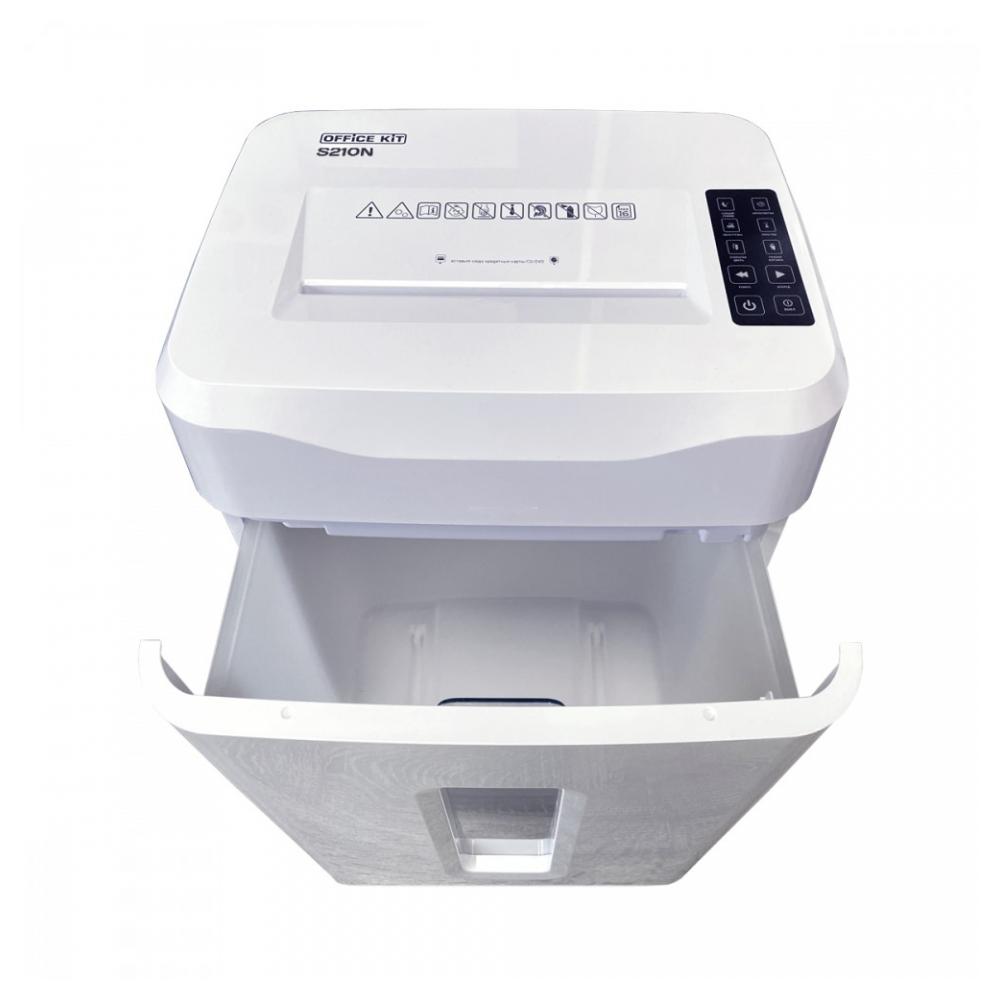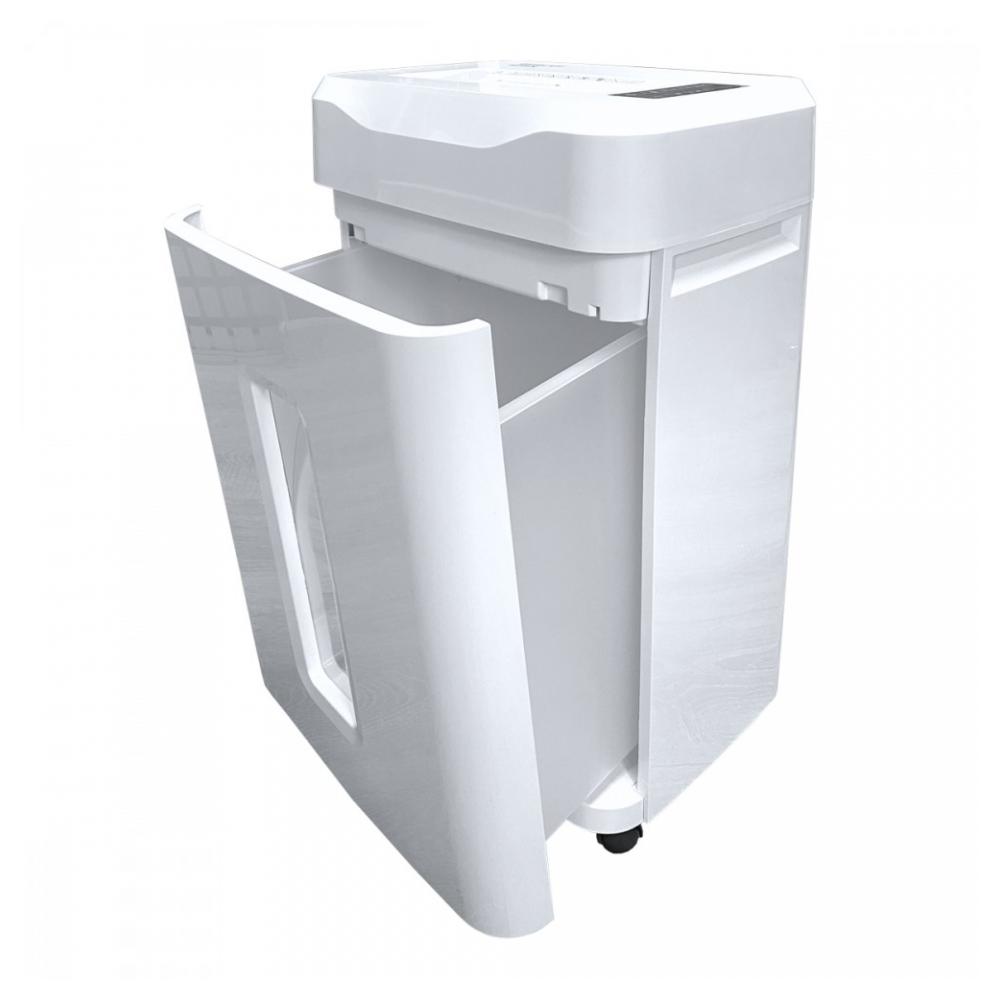 Функциональный уничтожитель документов для офисного применения, предназначенный для уничтожения большого количества листов за один раз. Аппарат уничтожает карты, канцелярские скрепки (до 2,5 см), скобы, пластиковые карты и CD-диски. Устройство снабжено индикаторами, сигнализирующими о включении, открытой корзине, перегрузке, перегреве и переполнении корзины. Кроме того, аппарат предлагает новейшие функции, включая энергосбережение и автоматическую очистку. Функция автоочистки позволяет уничтожать конверты, клейкие этикетки, стикеры и тд. После 50 циклов уничтожения, запускается функция автоочистки. Корзина устройства оборудована удобной ручкой и колесиками, что обеспечивает легкость в перемещении.