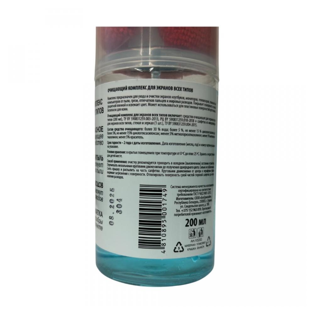 ОЧИЩАЮЩИЙ КОМПЛЕКС ДЛЯ ЭКРАНОВ ВСЕХ ТИПОВ! Комплекс предназначен для ухода и очистки экранов ноутбуков, мониторов, телевизоров, планшетов, компьютеров от пыли, грязи, отпечатков пальцев и жировых разводов. Покрывает поверхность защитной пленкой и освежает цвет. Может использоваться для пластиковых поверхностей оргтехники. Безопасно для кожи. Очищающий комплекс для экранов всех типов включает: средство очищающее для экран типов (200 мл), ТУ BY 590831259.003-2013, РЦ BY 590831259.010-2018 + салфетка из микрофибры для экранов всех типов, стекол и зеркал (1 шт.), ТУ ВY 590831259.004-2015. Состав очищающего средства: Вода - более 30% Циклогексасилоксан - более 5%, но менее 15% Циклопентасилоксан - менее 5% Метилхлоризотиазолинон - менее 5% Метилизотиазолинон - менее 5% Краситель - менее 5% Срок годности - 2 года с даты изготовления. Дата изготовления (месяц, год) и номер парти указан на упаковке. Условия хранения: в крытых помещениях при температуре от 0°С до плюс 25°С. Хранить в недоступном для детей месте. Способ применения: очистку рекомендуется проводить в холодном (выключенном) состоянии устройства. Перемешать несколькими круговыми движениями до получения однородного цвета. Сильно не взбалтывать. Снять крышку и распылить на часть салфетки. Круговыми движениями от центра к периферии убрать видимые загрязнения с поверхности. Отполировать поверхность сухой чистой стороной салфетки до исчезновения разводов.
